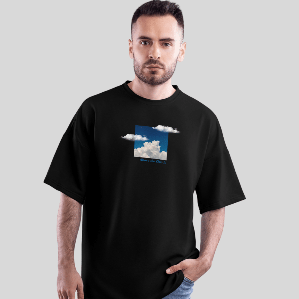 The front features a minimal cloudscape graphic with the text “Above the Clouds”, making it an ideal pick for those who love aesthetic streetwear, urban fashion, and statement graphic tees. Designed in a relaxed oversized fit, it offers ultimate comfort and a modern silhouette that pairs perfectly with jeans, cargos, or joggers.
