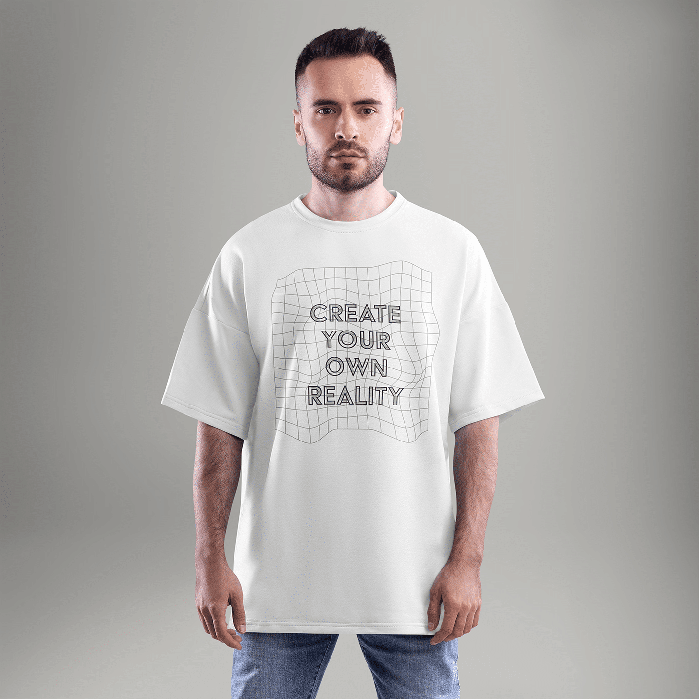 Minimalist design. Maximum intent. This oversized T-shirt features the empowering phrase “Create Your Own Reality” paired with an abstract arrow icon—symbolizing forward movement and self-made destiny. Made from 100% premium cotton French terry, it offers breathable comfort and relaxed streetwear vibes all day long.