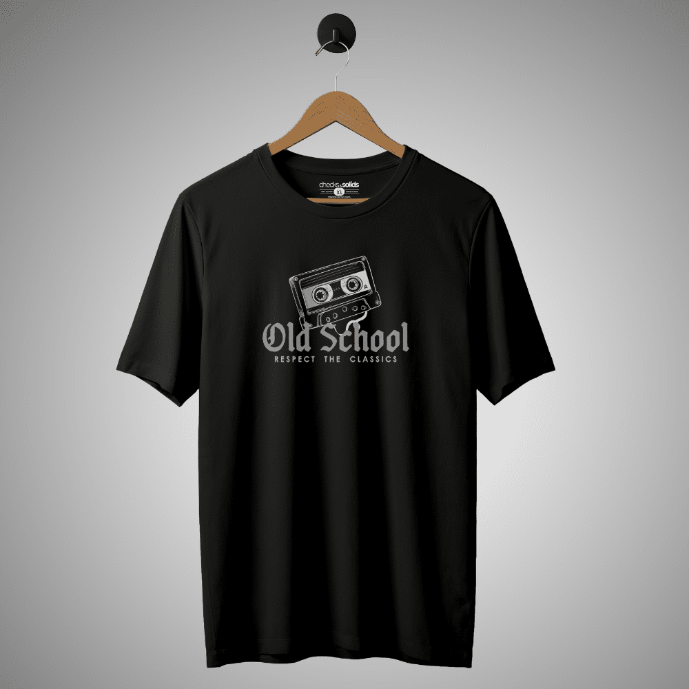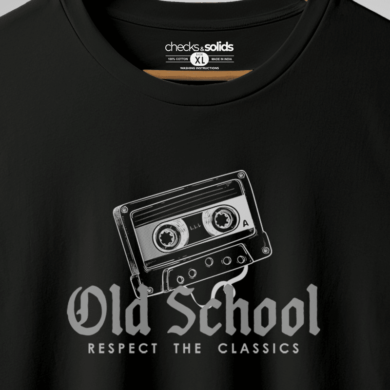 Bring back the retro vibes with the “Old School” cassette graphic T-shirt, a tribute to timeless classics. Made from 180 GSM premium fabric, this 100% cotton bio-washed tee delivers long-lasting softness, durability, and everyday comfort. The regular fit and vintage cassette design make it a perfect choice for music lovers and streetwear fans who appreciate nostalgia. A must-have black T-shirt from Checks & Solids for men and women.