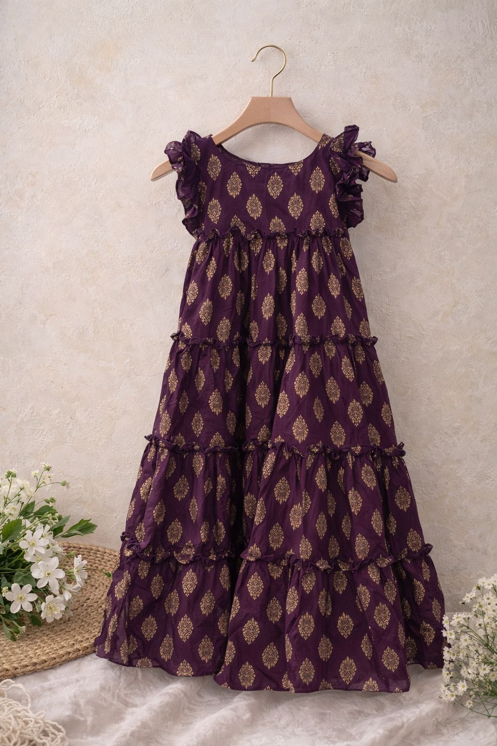 Purple Pure Cotton Ankle-Length Frock for Girls | Gold Print Layered Dress with Lining
