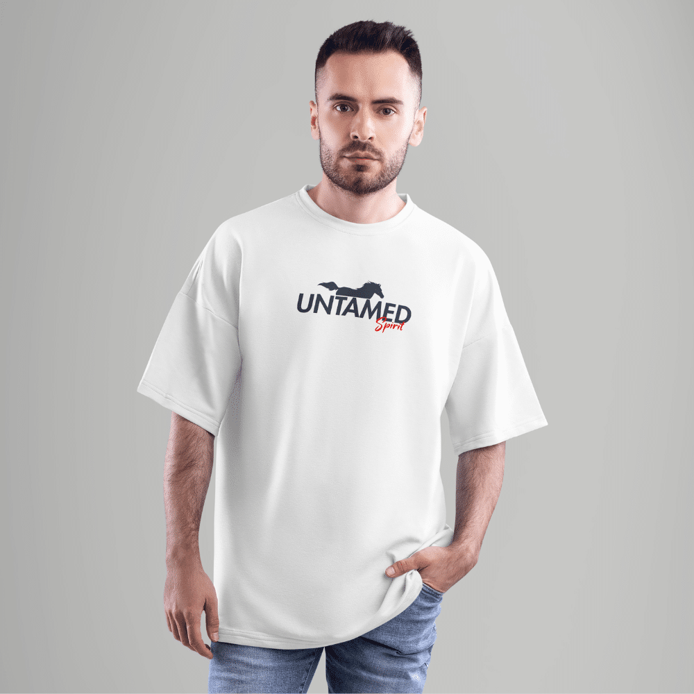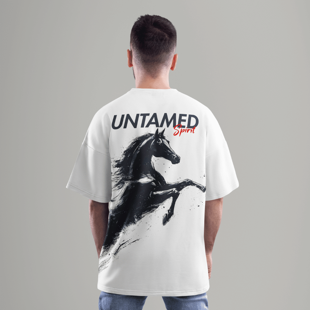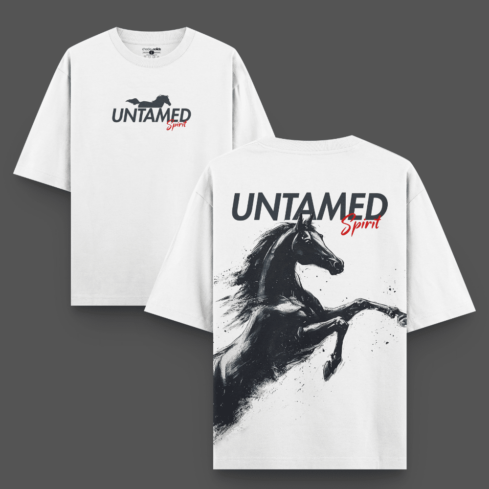 The design features a bold front chest print with the words “Untamed Spirit” alongside a running horse silhouette, while the back showcases a powerful rearing horse graphic — a symbol of freedom, strength, and individuality. Its oversized relaxed fit makes it the perfect pick for both casual styling and elevated streetwear looks.