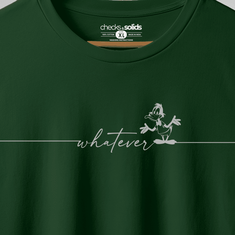 Keep it cool and effortless with the “Whatever” graphic T-shirt in deep green. Made from 180 GSM premium fabric, this 100% cotton bio-washed tee ensures exceptional softness, comfort, and long-lasting quality. With its regular fit and minimalist floral-inspired typography design, it’s perfect for casual outings, college wear, or everyday street style. A versatile unisex wardrobe essential from Checks & Solids.